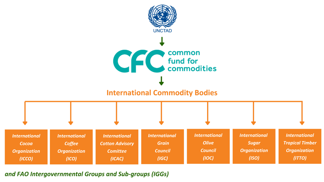 Since 1989, International Commodity Bodies (ICBs) have served as strategic advisors to the Common Fund for Commodities (CFC), guiding its project-based approach to commodity development. These ICBs include major organizations like the International Cotton Advisory Committee (1939), International Rubber Study Group (1944), International Grains Council (1949), International Lead and Zinc Study Group (1959), International Olive Council (1959), International Coffee Organization (1966), International Cocoa Organization (1973), and International Tropical Timber Organization (1986). For commodities not covered by formal ICB structures, the CFC collaborated with the Food and Agriculture Organization (FAO) through its intergovernmental groups and sub-groups in sectors such as bananas, tropical fruits, grains, oils and fats, hard fibers, meat, and dairy products. These partnerships enabled the Fund to pursue development-oriented cooperation across a wide spectrum of agricultural and non-agricultural commodities.